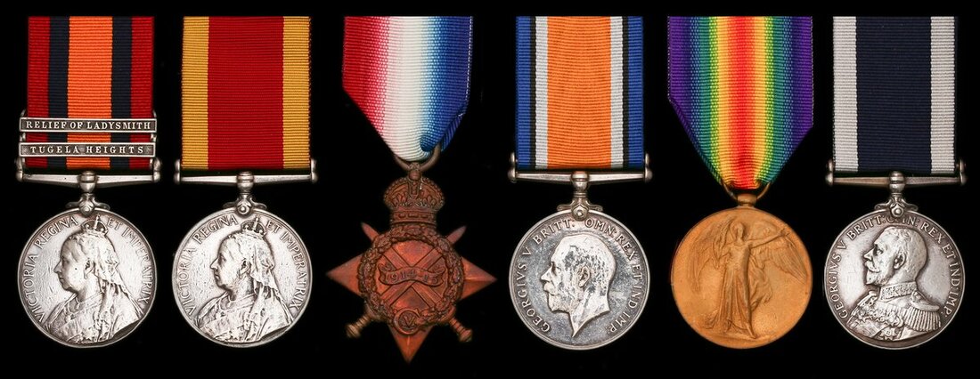 The campaign group of six awarded to Chief Petty Officer T. M. Webster, Royal Navy, who was severely wounded when a shell exploded on his 12-pounder gun at the Battle of Colenso - having been landed as a Bluejacket from Terrible