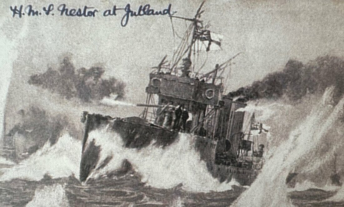 He was present at the Battle of Jutland, 31 May to 1 June 1916, when the Nestor, together with H.M.S. Nomad and Nicatar, launched an attack on the German Battle Cruisers; both Nestor and Nomad were sunk in the ensuing action, with the captain of the former, Commander the Hon. Edward Bingham, being awarded the Victoria Cross for his gallantry in leading the attack. Unleashed by Beatty at around 4 p.m. on 31 May, the destroyers of the 13th Flotilla made headlong for the enemy at a rate of 30 knots, those of the 2nd Division - under Bingham, V.C. in Nestor - bearing the brunt of 'an extremely warm welcome' from the German battlecruiser line.