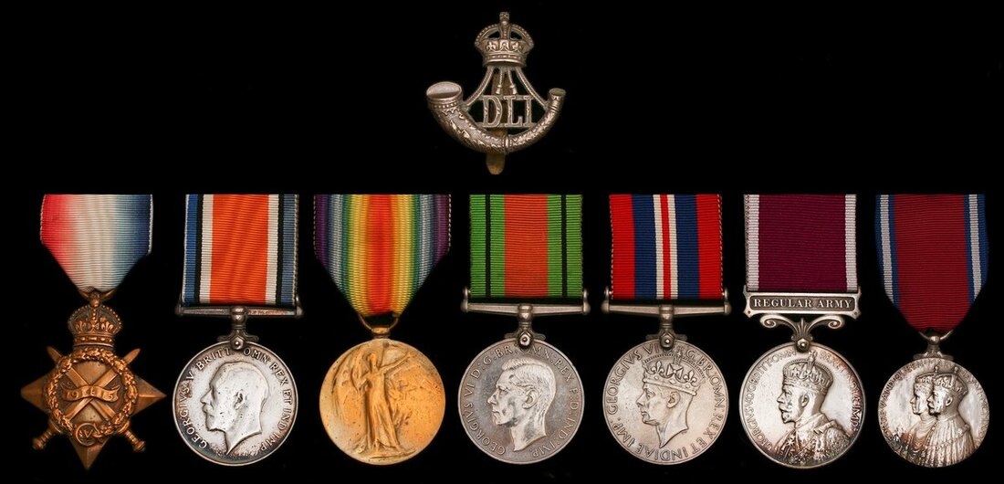 George Washbourne first entered the war in France on 12 May 1915 and also had the service number (83042). He is confirmed on the roll for the Jubilee 1935, no doubt as possibly the longest serving Private in the regiment. Sold together with a Durham Light Infantry cap badge.