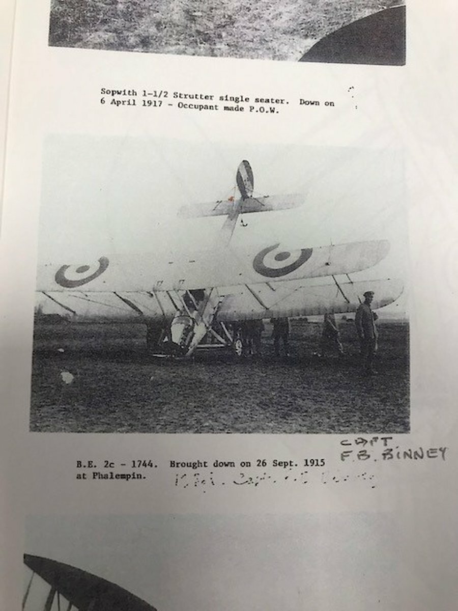 Binney was wounded in the left lung, and after having landed nose first south of Phalempin, was taken prisoner of war. His report, written 3 August 1918, gives the following: