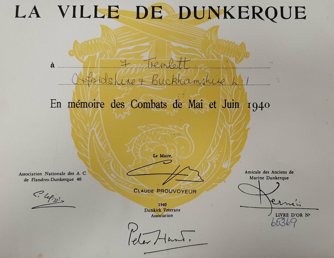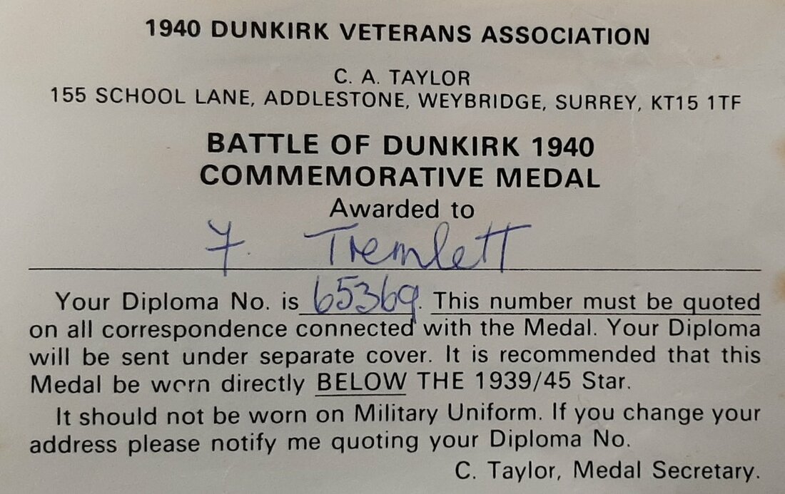 Whilst there Tremlett was promoted to Regimental Sergent Major on 10 December 1939 during the 'Phoney War' which prevailed along the frontiers. His unit was soon to see more than its fair share of fighting however, most notably during the stand made at the Ypres-Comines Canal between 26-28 May. Despite heavy fighting the German advance ground on and they were soon surrounded at Dunkirk, embarking H.M.S. Worcester and S.S. Maid of Orleans at Dawn on 1 June 1940.