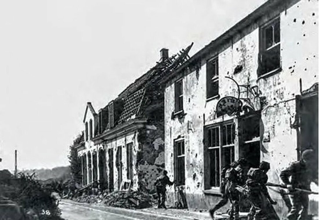 Even gaining a foothold in the village proved difficult, however after several repulses they managed to do so, establishing a position from which the Germans tried madly to dislodge them. The Battalion fought back bloodily, notably making use of their combat knives to preserve ammunition and prevent the Germans from locating their positions.