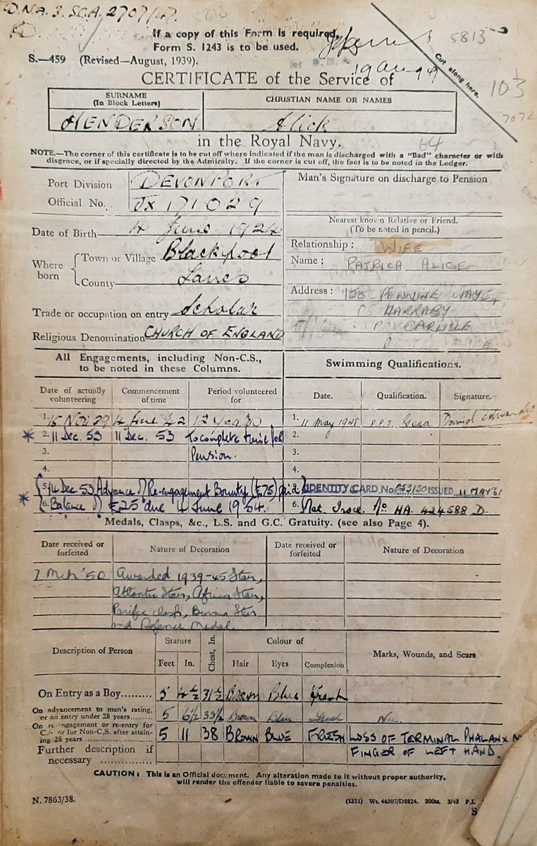 Alick Henderson was born at Blackpool, Lancashire on 4 June 1924 and enlisted in the Royal Navy on 29 November 1939 as a Boy Seaman Class 2 with the service number D/JX 171029 at age 15. His first service afloat was with H.M.S. King George V in November 1939 and with her joined the early Atlantic Convoys seeing service in BHX104, traveling to Halifax by way of Bermuda.