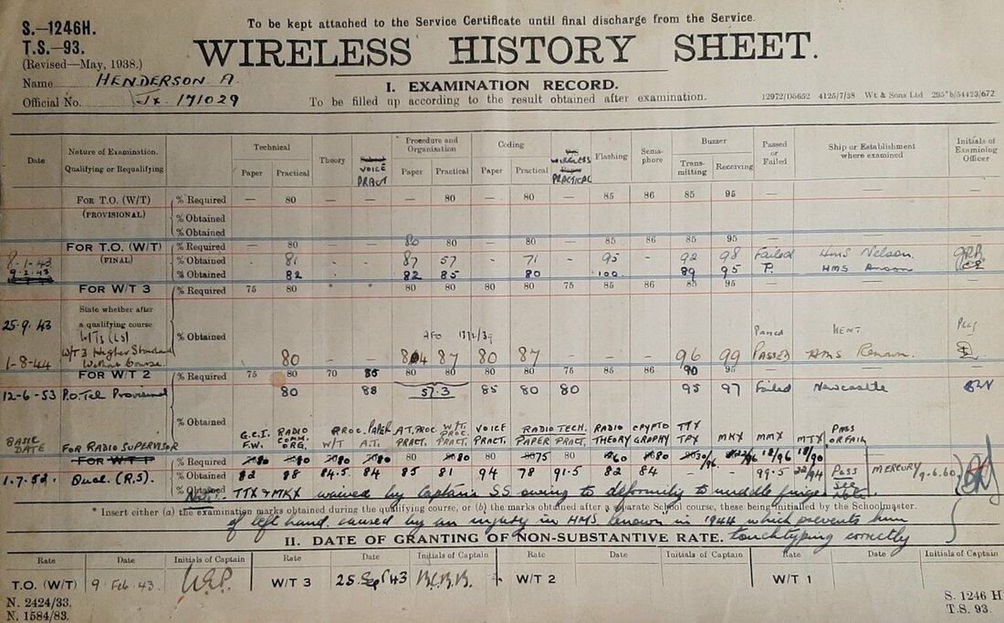 Original Wireless History sheet, Examination Record, with dates ranging between March 1941 and October 1959.