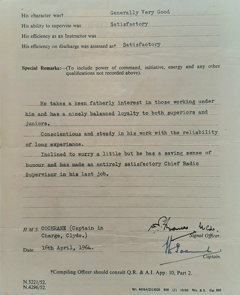 Promoted Leading Radio Operator on 31 October 1958 he joined the Joint Service Amphibious Warfare Centre at Poole in November 1958. Further advanced Radio Supervisor with Bermuda on 2 May 1961 before joining Ark Royal in June 1961 where he was finally advanced Acting Chief Radio Supervisor on 21 August 1963. Finally going ashore in April 1964 he retired on 9 June that year after almost 25 years of service; sold together with copied research and an impressive archive of original material comprising: