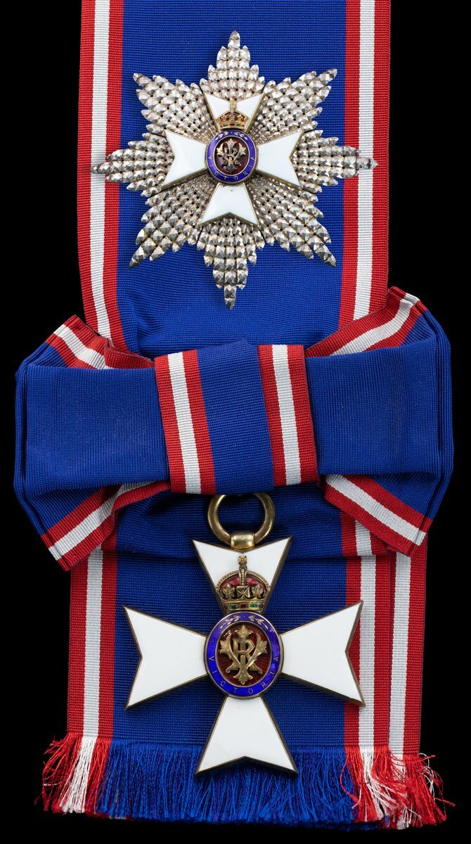 (x) The Royal Victorian Order, Knight Grand Cross (G.C.V.O.) set of Insignia, comprising sash Badge, 88mm including suspension x 72mm, silver-gilt and enamel, '256' to reverse, on full sash riband; breast Star, 89mm, silver-gilt and enamel, '256' to reverse, some minor chips to enamel but otherwise very fine, in Garrard and Co, London case of issue