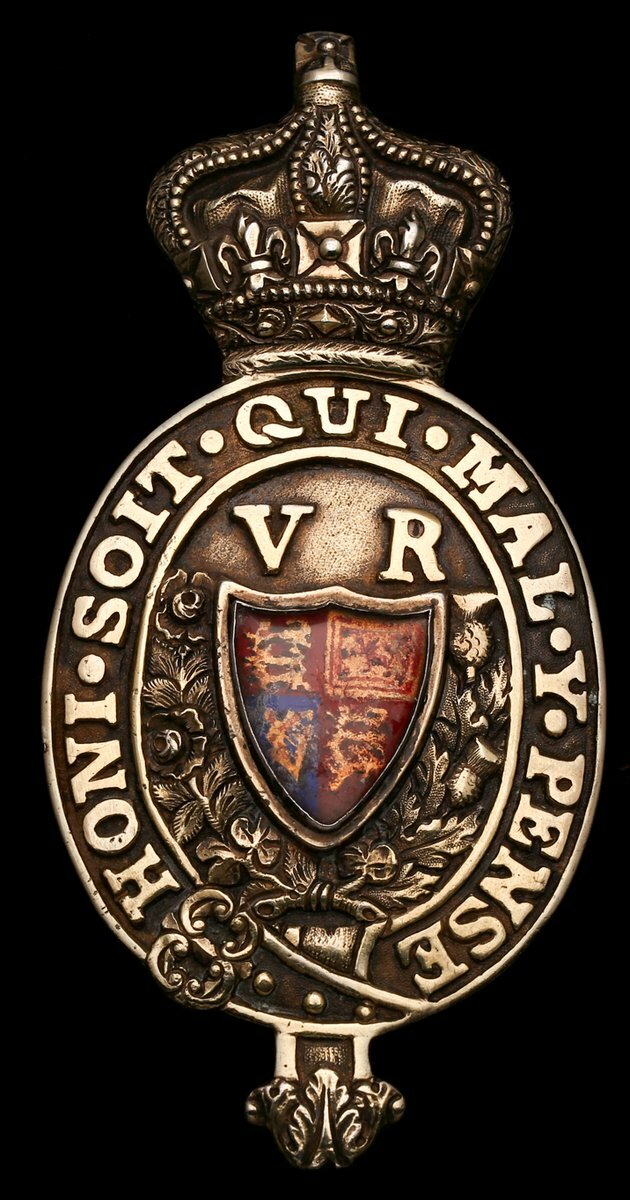 (x) Queen's Messenger Badge, V.R. issue, large oval badge in silver-gilt, 111mm x 54mm, the central royal arms painted and glazed, lacking pendant silver greyhound and ring for suspension, later retaining pin and catch added to reverse, very fine