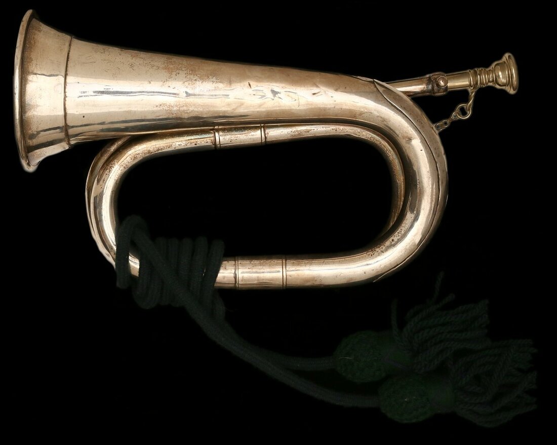 (x) A silver Presentation Bugle presented by the Cowan family to the Highland Light Infantry, made by Henry Potter & Co, London, hallmarked 'H.P London 1901', the bell with feint engraving of a Highland Light Infantry badge above 'from' with a shell like symbol and motto 'SIC ITUR IN ALTUM' in riband below, this being the arms of the Cowan family, fitted with removable white metal mouthpiece this attached to the bugle by a chain, with later decorative tassels with various dents and polishing commensurate with wear, otherwise very fine overall