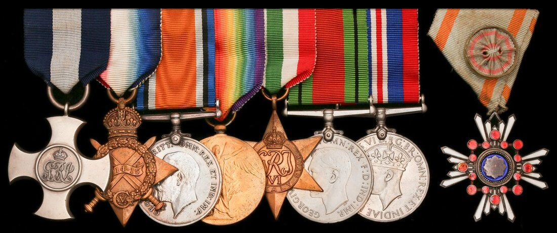 Distinguished Service Cross, G.V.R., engraved to the reverse 'Lieut. H. P. Keeley, R.N. 1918', hallmarked for 1919; 1914-15 Star (Lieut. H. P. Keeley, R.N.); British War Medal 1914-20 (Lieut. H. P. Keeley. R.N.); Victory Medal 1914-1919 (Lieut. H. P. Keeley. D.S.C. R.N.); Italy Star; Defence and War Medals 1939-45; Japan, Imperial, Order of the Sacred Treasure, 4th class, silver and enamel, engraved to the reverse 'Lieut H P Keeley. R.N. 1918', sold together with the recipient's Royal Humane Society Bronze Medal (Harold P. Keeley, Nov. 12. 1907), the Victory Medal a somewhat later replacement, the British awards mounted as worn, minor pitting and contact wear, slight cracking to the enamel on eighth, overall good very fine (9)