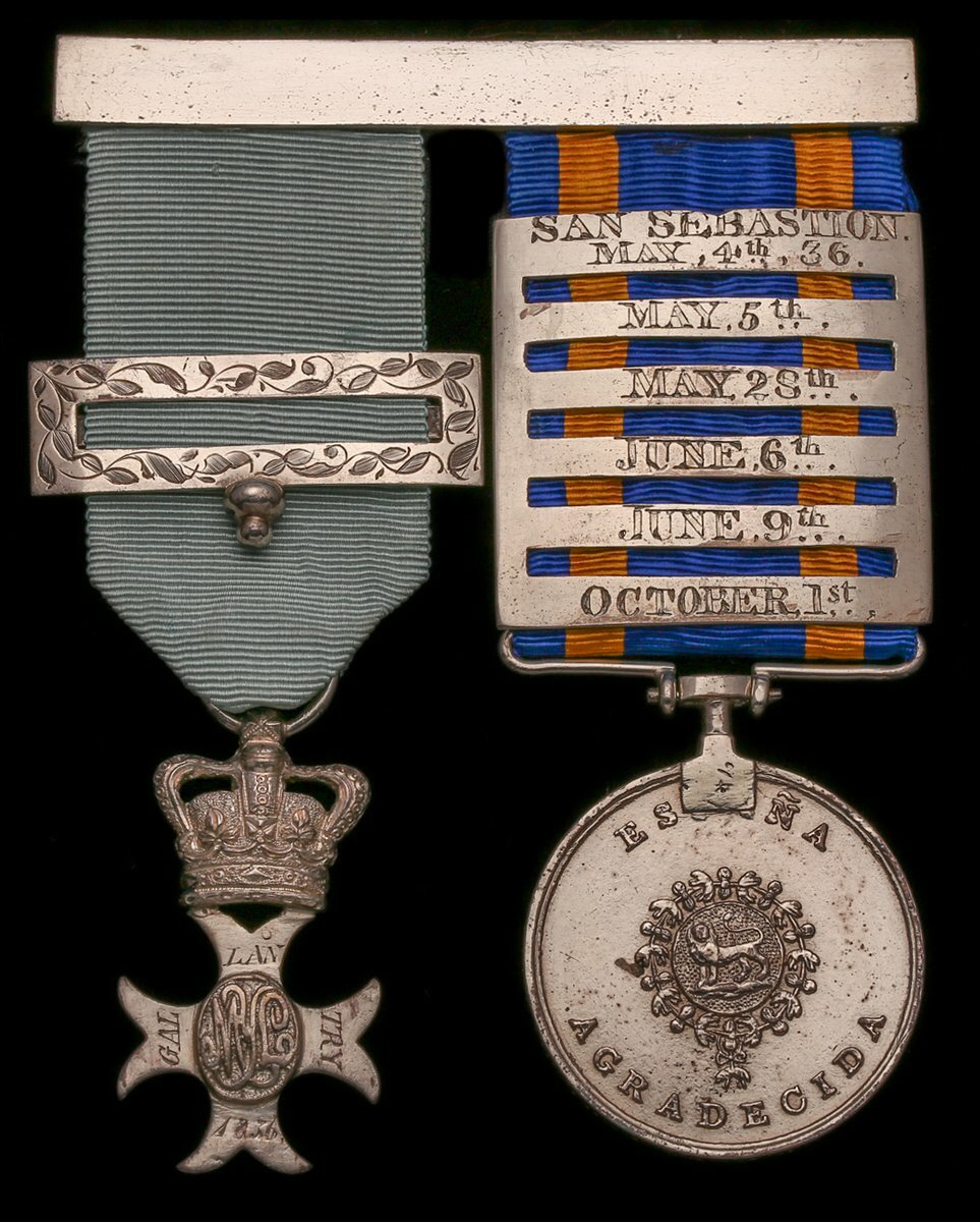 Spain, Kingdom, Order of Maria Isabella Luisa, silver Cross, the obverse engraved 'GALLANTRY - 1836' the, reverse engraved 'SAN SEBASTIAN'; Spanish Medal for San Sebastian 5 May 1836, 6 private engraved clasps, San Sebastion (sic) May 4th, 36; May 5th; May 28th; June 6th; June 9th; October 1st, the rim engraved 'Robert McGahan, Sergeant, Artillery Regiment, B.A.L.', the first with ornate riband bar, mounted on riband bar, contact marks, very fine (2)