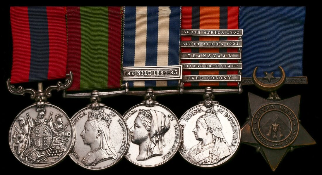 Distinguished Conduct Medal, V.R. (1389 R. Sgt. Maj: B. Turner. 10th. Hussars 16th. Feb. 1885.) ‘R’ in rank corrected; Afghanistan 1878-80, no clasp (1389. Lce. Corpl. B. Turner. 10th. Rl. Hussars.); Egypt and Sudan 1882-89, undated reverse, 1 clasp, The Nile 1884-85 (1389, R.S. Maj: B. Turner, 10th. Husrs.); Queen’s South Africa 1899-1902, 5 clasps, Cape Colony, Orange Free State, Transvaal, South Africa 1901, South Africa 1902 (Capt: Ridg: Mr: B. Turner, 6/Drgn: Gds:) date clasps both tailor’s copies; Khedive’s Star 1884-6, the group mounted cavalry style as worn, light contact marks to second and third, otherwise good very fine (5)