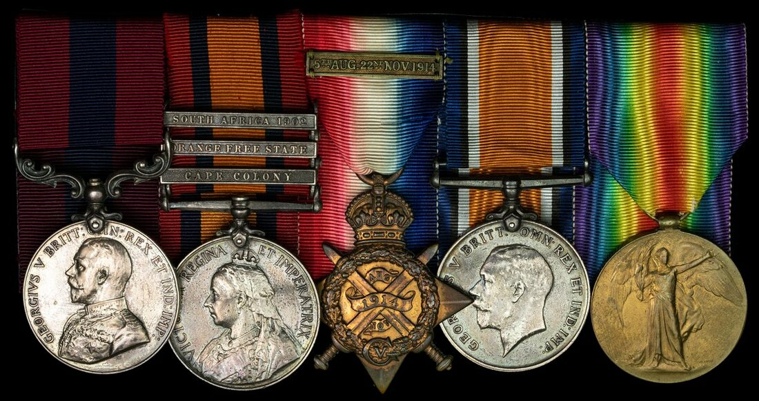 Distinguished Conduct Medal, G.V.R. (7575 Sjt. D. Carroll. 7/Rif: Bde:); Queen's South Africa 1899-1902, 3 clasps, Cape Colony, Orange Free State, South Africa 1902 (7575 Pte D. Carroll. Rifle Brigade.); 1914 Star, with clasp (7575 L. Cpl D. Carroll. 3/Rif: Brig.); British War Medal 1914-20 (7575 W.O.CI.II. D. Carrol. Rif. Brig.), note surname spelling; Victory Medal 1914-19 (7575 W.O.CL.2. D. Carroll: Rif. Brig.), court mounted for display, some scratches but otherwise very fine (5)