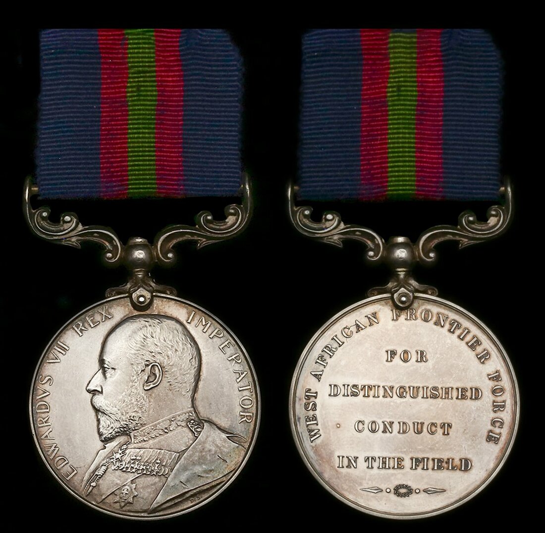A scarce Northern Nigeria 1903-04 West African Frontier Force D.C.M. awarded to Sergeant B. Duchi, Northern Nigerian Regiment, who was decorated, wounded and further deserving of special consideration for his part in the Okpoto operations