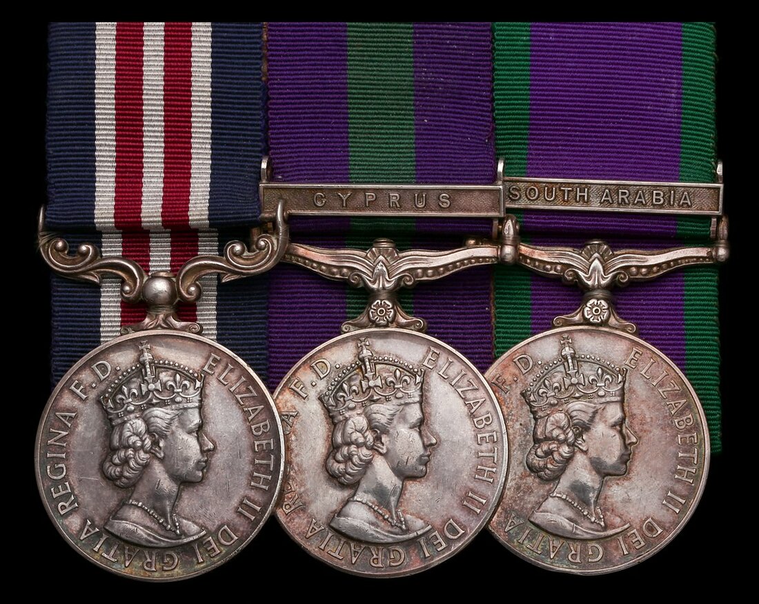 Military Medal, E.II.R., 2nd issue (22850005 Sgt. B. G. Harrison. R.A.); General Service 1918-62, 1 clasp, Cyprus (22850005 Sgt. B. G. Harrison. R.A.); General Service 1962-2007, 1 clasp, South Arabia (22850005 Sgt. B. G. Harrison. RHA.) mounted as originally worn, minor edge bruising, very fine (3)