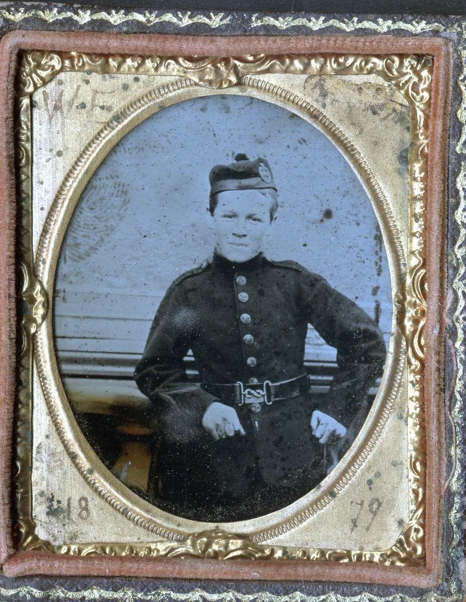 A daguerreotype of Grovier, aged 15, in his Band boy uniform, 75mm x 62mm.
