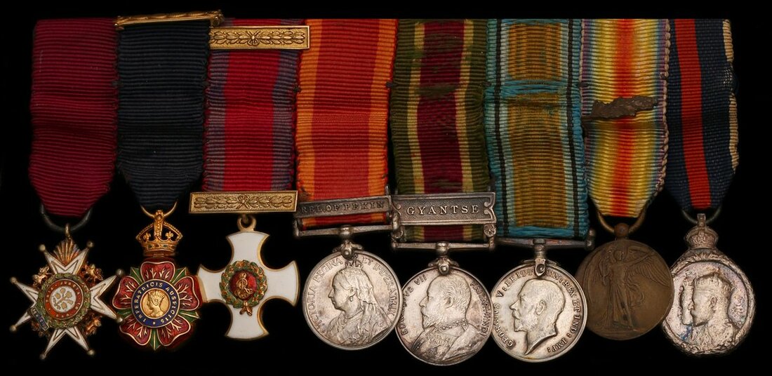 The Most Honourable Order of the Bath, Military Division, silver-gilt and enamel; The Most Eminent Order of the Indian Empire, gold and enamel, with top suspension bar; Distinguished Service Order, E.VII.R., gold and enamel; China 1900, 1 clasp, Relief of Pekin; Tibet 1903-04, 1 clasp, Gyantse; British War and Victory Medals, with M.I.D. oak leaves; Coronation 1902, silver issue, mounted ordinary style for wear, some wear to ribands, all very fine (8)