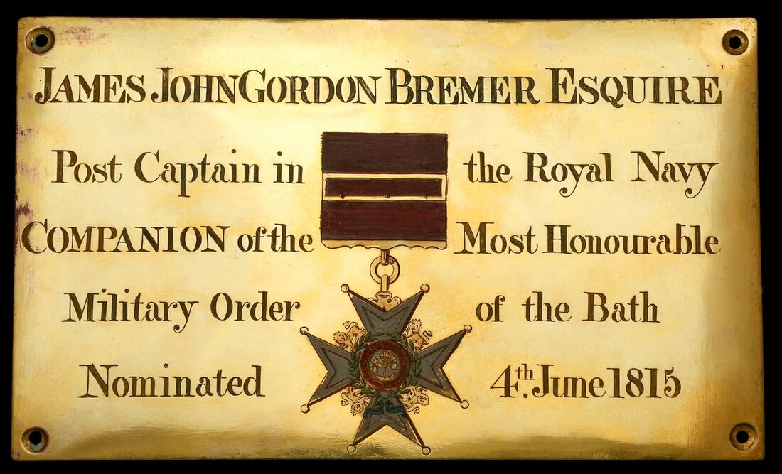 The Order of the Bath Chapel Stall Plate created for Rear-Admiral Sir James Bremer K.C.B., K.C.H., who served as an officer in the Royal Navy throughout the Napoleonic Wars and was later much involved in colonial enterprises in Australia and Burma; he later became Commander-in-Chief of British forces during the First Opium War and was the man responsible for overseeing the formal possession of Hong Kong on 26 January 1841