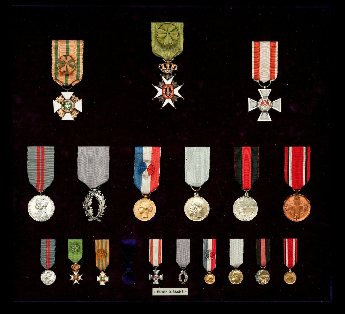 United Kingdom, Coronation 1911; Luxembourg, Grand Duchy, Order of the Oaken Crown, breast Badge, silver-gilt, gold and enamel; Sweden, Kingdom, Order of the Vasa, breast Badge, silver-gilt and enamel; Germany, Prussia, Order of the Red Eagle, breast Badge, by Wagner, Berlin, silver and enamel, maker's initial 'W' to lower arm; France, Republic, Order of Academic Palms, silver and enamel; France, Ministry of the Interior, Medal of Devotion, gold, the reverse officially inscribed 'Edwin Otto Sachs, Juillet 1903'; Russia, Imperial, Medal for Zeal, silver-gilt; Russia, Imperial, Medal for Zeal, silver; Germany, Prussia, Red Cross Medal, bronze, housed in display frame with corresponding miniature awards, good very fine (18)