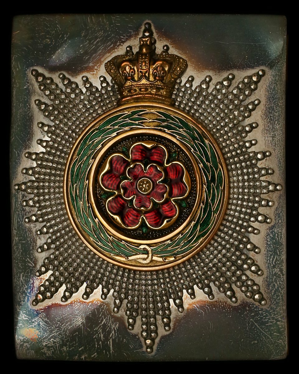 2nd Royal Lancashire Militia Officer's shoulder belt plate, Victorian era, silver, silver-gilt and enamel, applied with a multi-pointed hobnail gilt crowned circlet of green enamelled laurel leaves encircling a red enamelled rose of the House of Lancaster. The reverse with two hooks and two fastening studs, hallmarks for Jennens & Co., Birmingham 1852, with leather backing, this marked 'VC', lightly toned, very fine