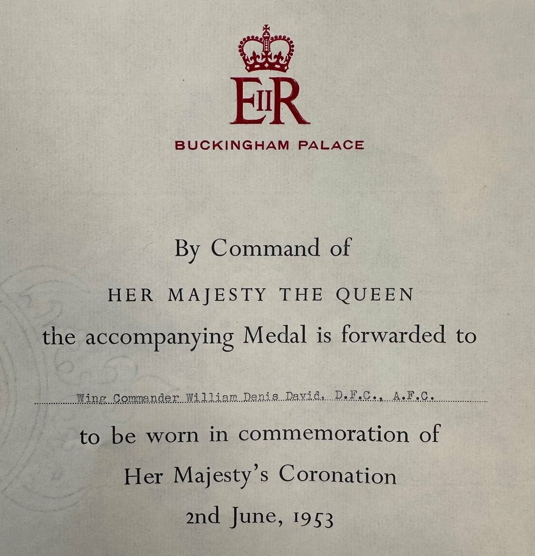 Certificate for the 1953 Coronation Medal, in the name of 'Wing Commander William Dennis David, D.F.C., A.F.C.'.