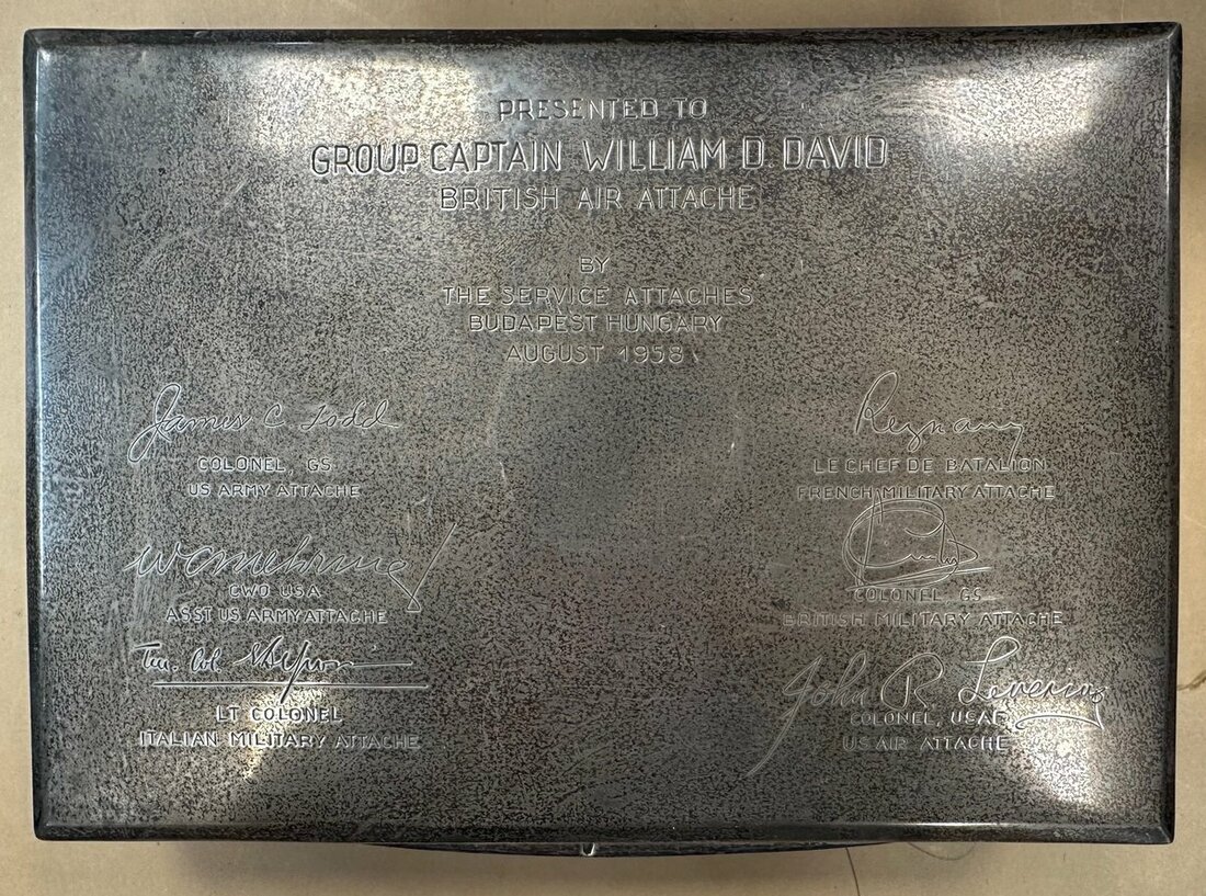 A large silver cigarette box, local marks (weight 1123g including wooden divider), 240mm x 175mm x 50mm, the lid engraved 'Presented to Group Captain William D. David, British Air Attache by The Service Attaches, Budapest, Hungary, August 1958' further inscribed by the various Allied counterparts.