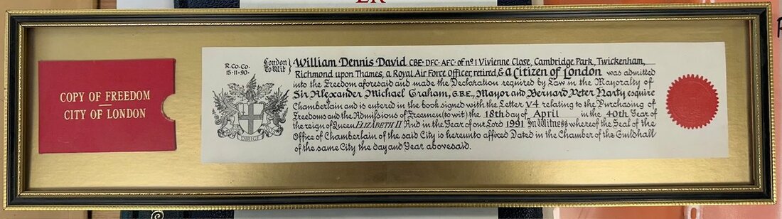 His Freedom of the City of London, dated 18 April 1991, glazed and framed.