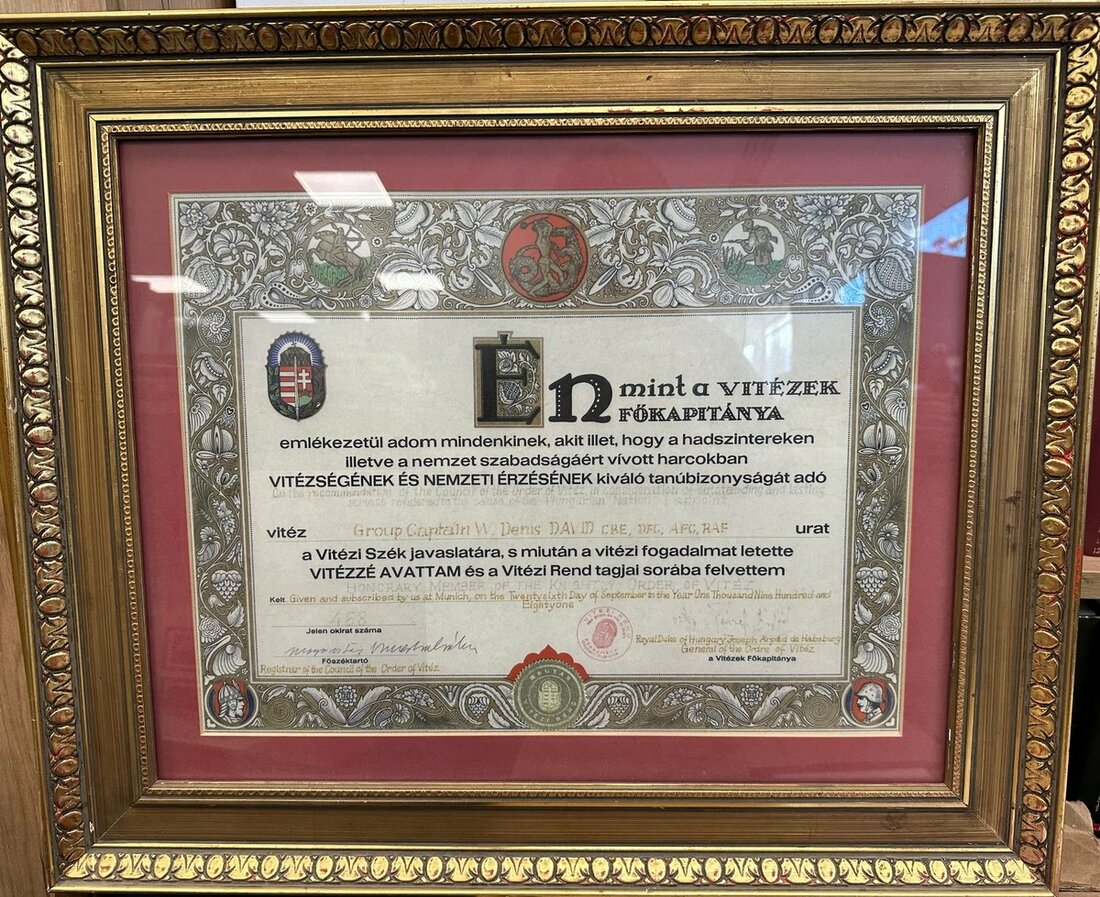 His Hungarian Order of Vitéz certificate, dated 26 September 1981, Order of Vitéz, glazed and framed, together with miniature Badge of the Order framed.