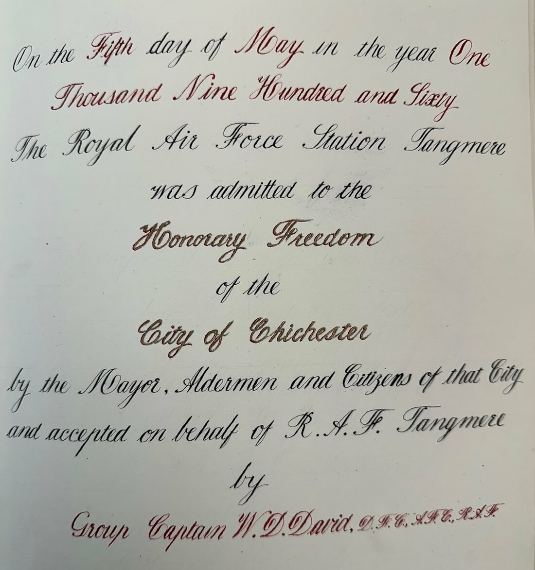 Freedom of the City of Chichester, an ornate leather-bound and illuminated document, dated 5 May 1960, with Station Badge for RAF Tangmere and the City Arms, the calligraphy executed by Flying Officer Willsher, with photographs of the event, besides two panoramic photographs, HQ Allied Forces Southern Europe Certificate, overall a good archive, very fine (Lot)