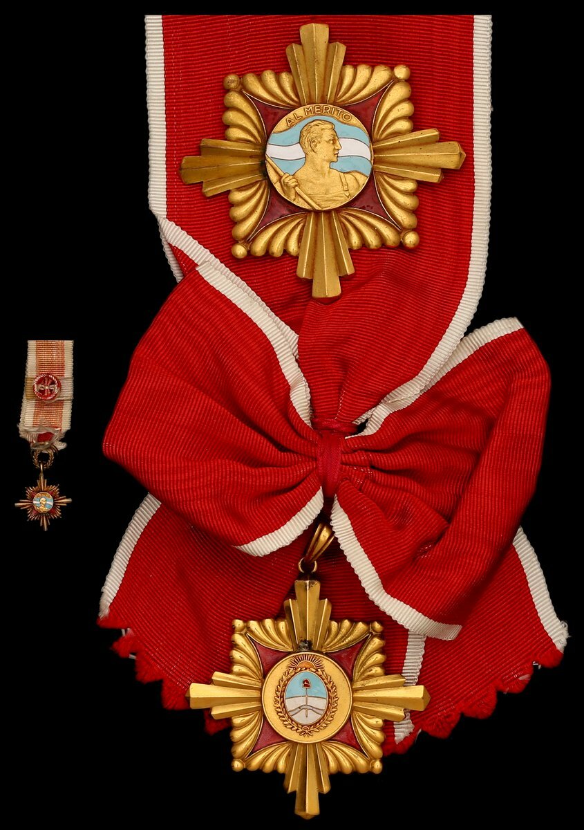(x) Argentina, Republic, Order of Merit, a very rare 1st Class set of Insignia, comprising sash Badge, 67mm, silver-gilt, gilt and enamel; Star, 81mm, gilt and enamel, pin detached but present from Star, very fine, together with sash riband and corresponding miniature award (3)