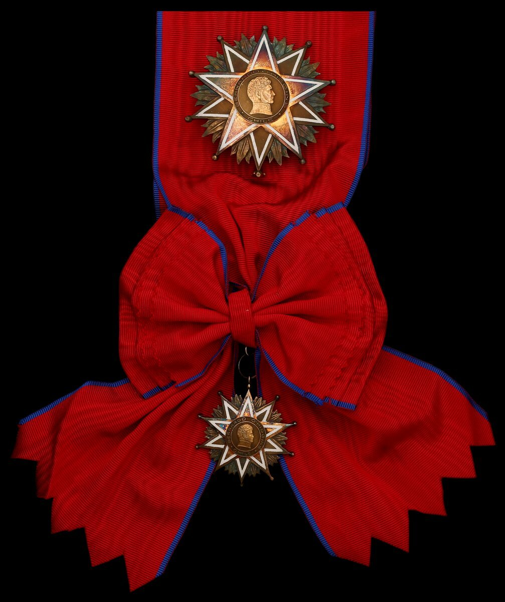 (x) Chile, Republic, Order of Bernardo O'Higgins, 1st Class set, by Hours, Santiago, Chile, comprising sash Badge, 47mm, silver-gilt and enamel; breast Star, 69mm, silver-gilt and enamel, good very fine, with full sash riband and in fitted case of issue