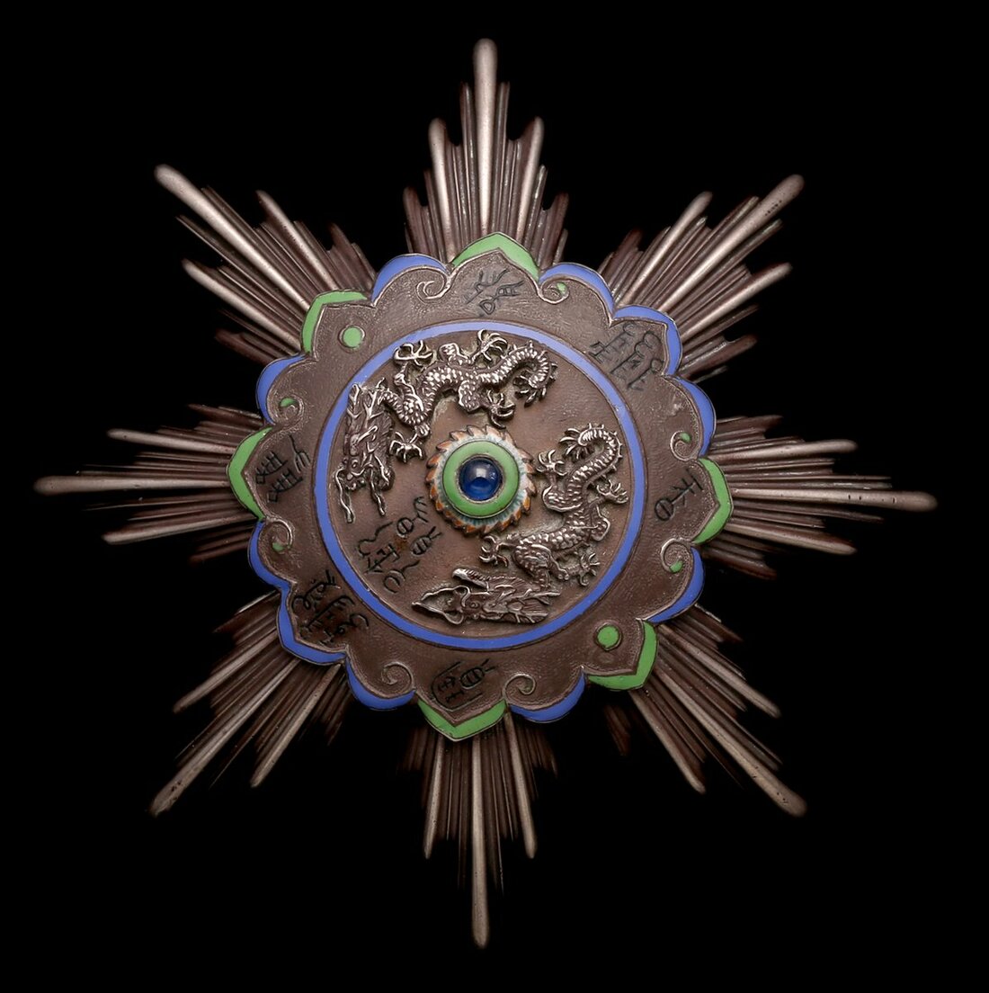 (x) China, Empire, Order of the Double Dragon, 1st Type (1881-96), an outstanding breast Star of Russian manufacture, 89mm, silver (88 kokoshnik) and enamel, the centre enhanced with a cabochon sapphire, maker's initials and marks for St Petersburg to retaining pin, of outstanding quality, very fine