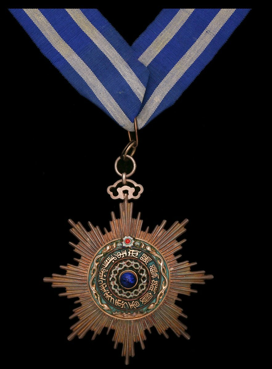 (x) China, Empire, Order of the Double Dragon, 2nd Type, 1st Grade, Commander's neck Badge, 98mm including suspension x 90mm, silver, silver-gilt and enamel, the centre enhanced with a cabochon sapphire, the two dragons meeting at a small red coral, good very fine, with original neck riband and all fittings as worn