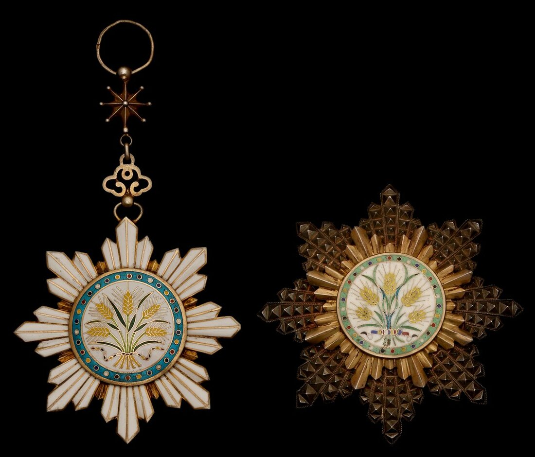 (x) China, Republic, Order of the Precious Brilliant Golden Grain, 1st Class set of Insignia, comprising sash Badge, 108mm including suspension x 72mm, silver-gilt and enamel, local hallmarks to ring; breast Star, 84mm, silver-gilt, silver and enamel, local characters to reverse and local hallmarks to retaining clip, a little red enamel crazing to reverse of Badge, very fine and a good set (2)