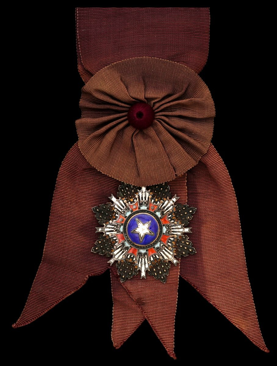 (x) China, Republic, Order of the Brilliant Star, sash Badge, silver and enamel, officially numbered '156' to reverse, with maker's cartouche to reverse, on full sash riband, this last faded in parts, crazed enamel, chips throughout, about fine