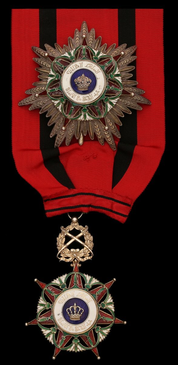 (x) Iraq, Kingdom, Order of Rafidain (Two Rivers), Military Division, Grand Cross set of Insignia, comprising sash Badge, 91mm including crossed swords suspension x 67mm, silver-gilt and enamel; breast Star, 88mm, silver, silver-gilt and enamel, the reverse gilt, traces of old polish, good very fine, with length of original sash riband