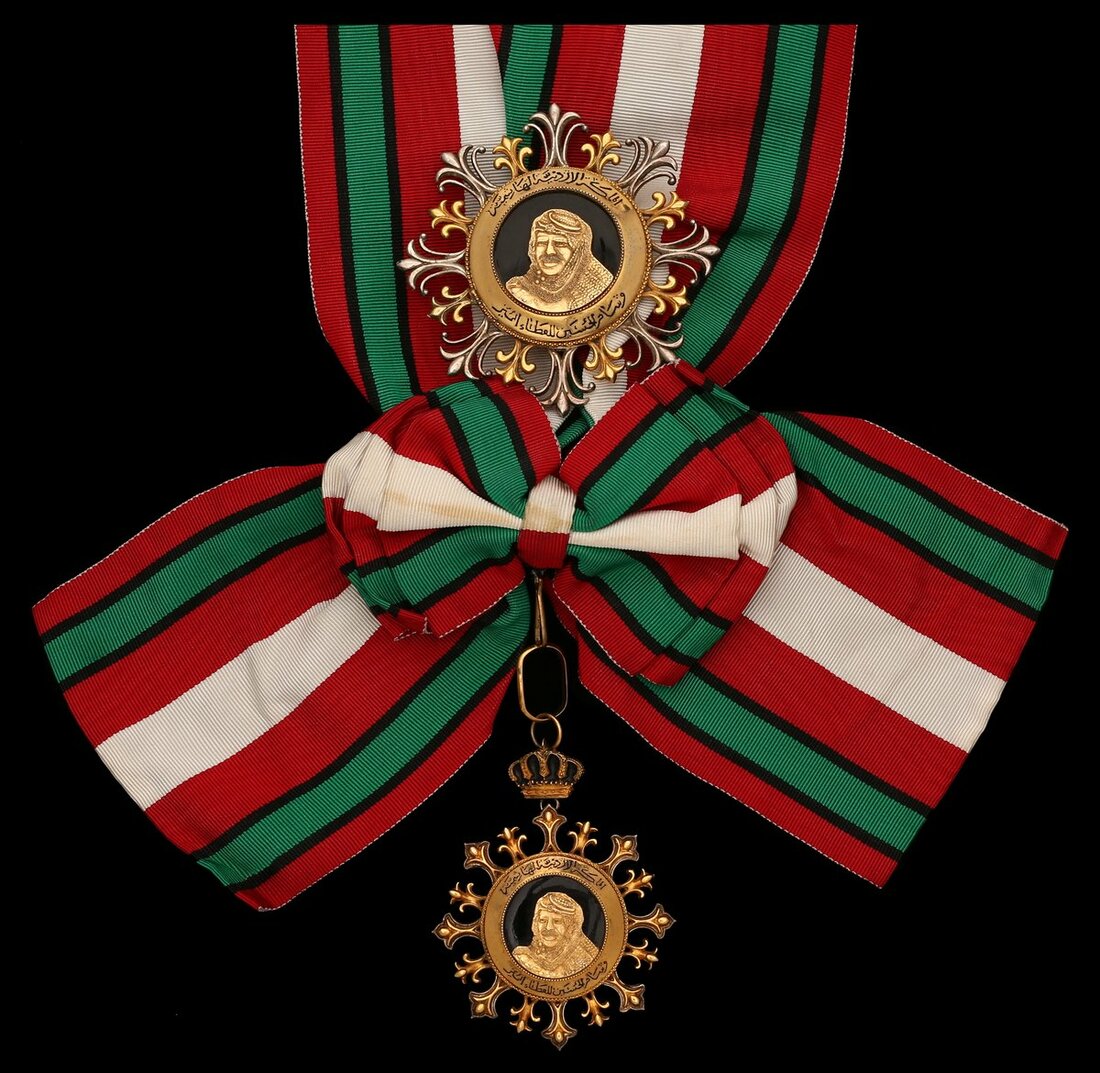 (x) Jordan, Hashemite Kingdom, Order of King Hussein, Grand Cross set of Insignia, by Worth, Switzerland, comprising sash Badge, 75mm including crown suspension x 60mm, silver-gilt and enamel; breast Star, 80mm, silver, silver-gilt and enamel, both with maker's name and '925' to the reverse, good very fine, with full sash riband (2)