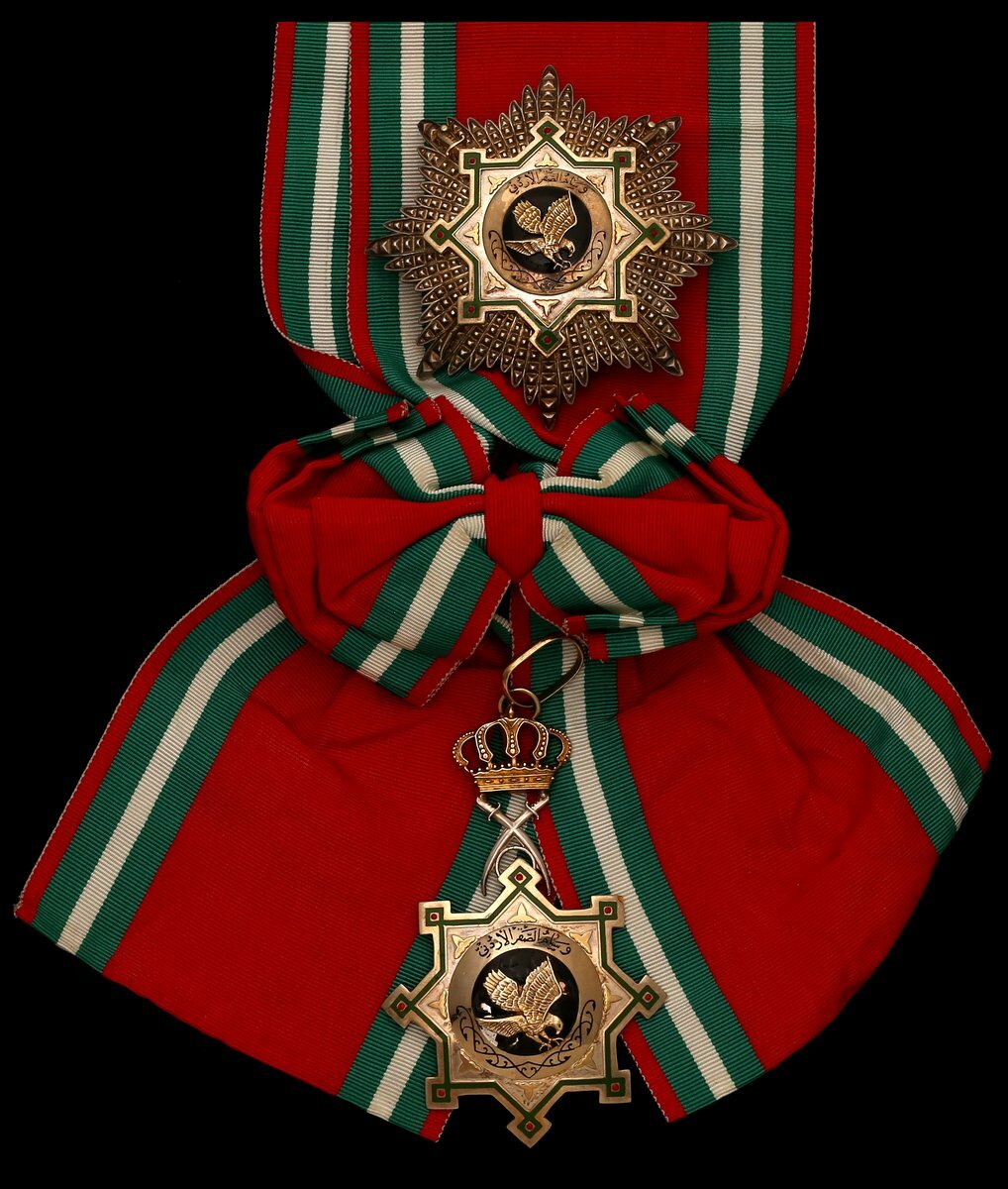 (x) Jordan, Hashemite Kingdom, Order of the Jordanian Falcon, Grand Cross set of Insignia, by Worth, Switzerland, comprising sash Badge, 93mm including crown and crossed sword suspension x 48mm, silver-gilt and enamel; breast Star, 77mm, silver, silver-gilt and enamel, both with maker's name and marked '925' to the reverse, black enamel chipping to the Badge, very fine, with full sash riband (2)