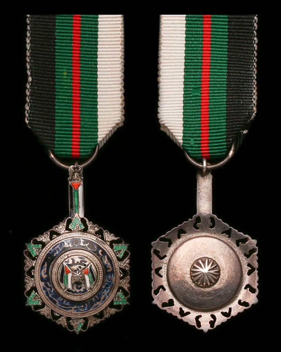 Indeed upon the incorporation of the Hejaz into Saudi Arabia in 1925 both orders became Trans-Jordanian awards and awarded by King Hussein's son Abdullah, later King Abdullah of Jordan and they now have become Jordanian awards. The Order itself displays the Hejira year 1334 (period 9 November 1915-27 October 1916 inclusive), in the centre two crossed Hijazi flags with a five-pointed star in the centre and the inscription 'His Servant Ali bin Al Hussein'.