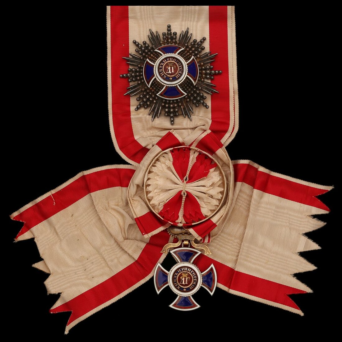 (x) Montenegro, Kingdom, Order of Danilo, Grand Cross set of Insignia, by Vinc Mayer's Sohne, Vienna, comprising sash Badge, 74mm including crown suspension x 51mm, silver-gilt, gold and enamel; breast Star, 84mm, silver, gold and enamel, maker's cartouche to reverse and silver marks to retaining pin, good very fine, with original sash riband