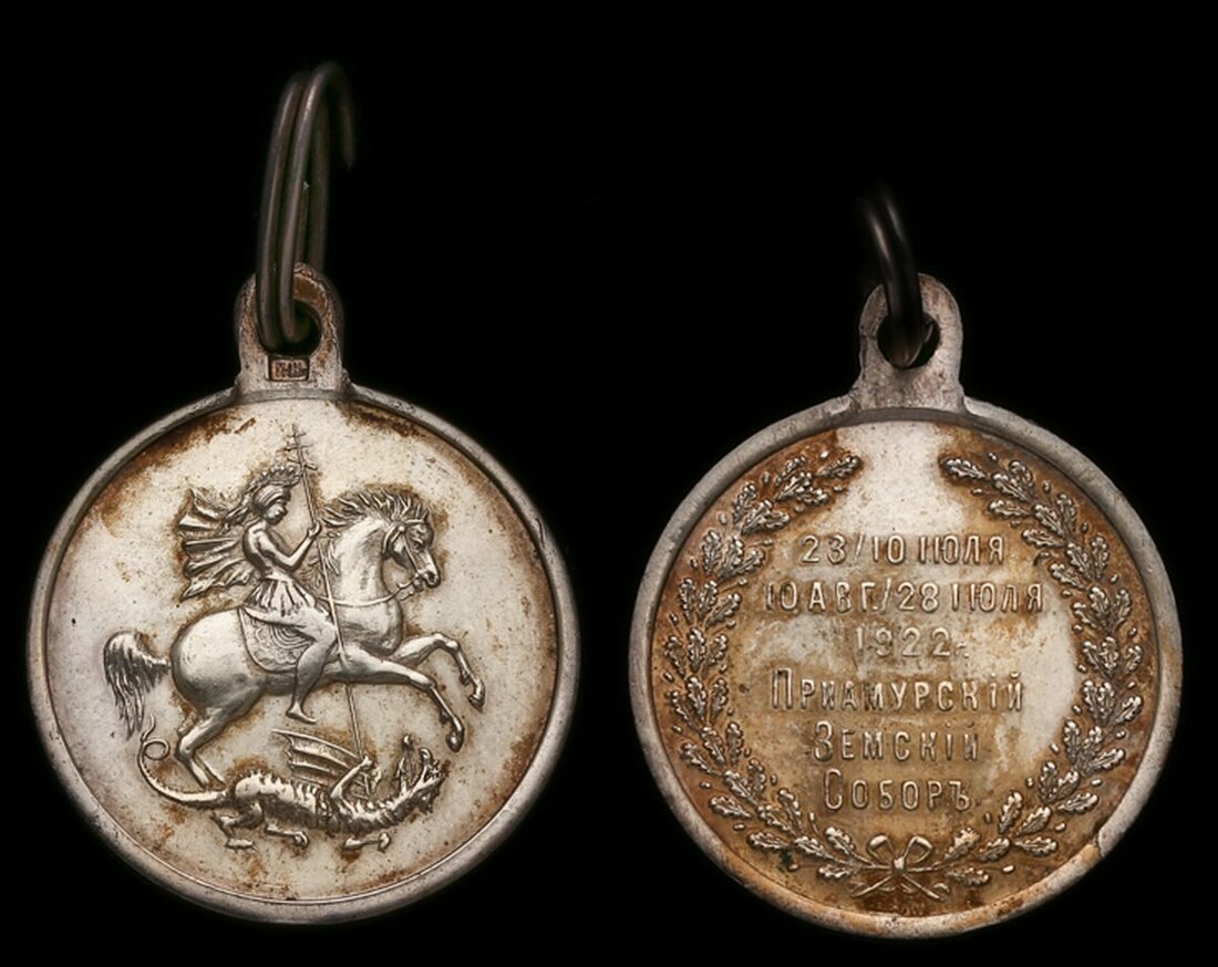 (x) Russia, Imperial, Primorsky Zemsky Sobor 1922 Medal, silver, initials 'P.Sh.' for P. Shulgin by loop, obverse depicting St George slaying the dragon, the reverse with the inscription for the dates 23 July-10 August 1922, with loop for wear, nearly extremely fine