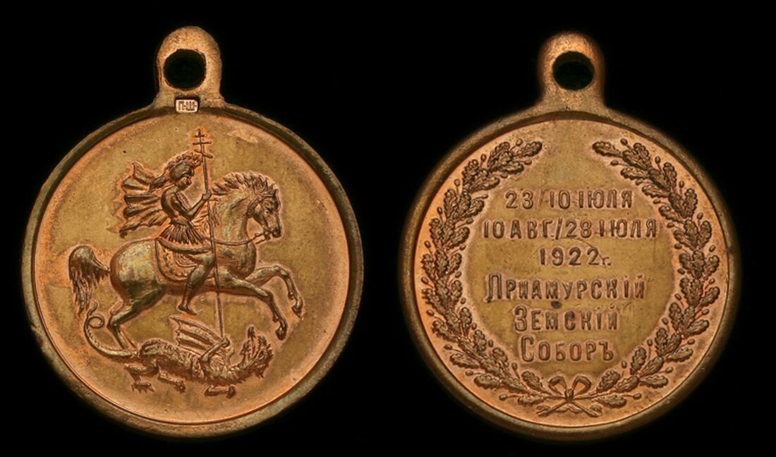 (x) Russia, Imperial, Primorsky Zemsky Sobor 1922 Medal, gilt bronze, initials 'P.Sh.' for P. Shulgin by loop, obverse depicting St George slaying the dragon, the reverse with the inscription for the dates 23 July-10 August 1922, without loop, nearly extremely fine