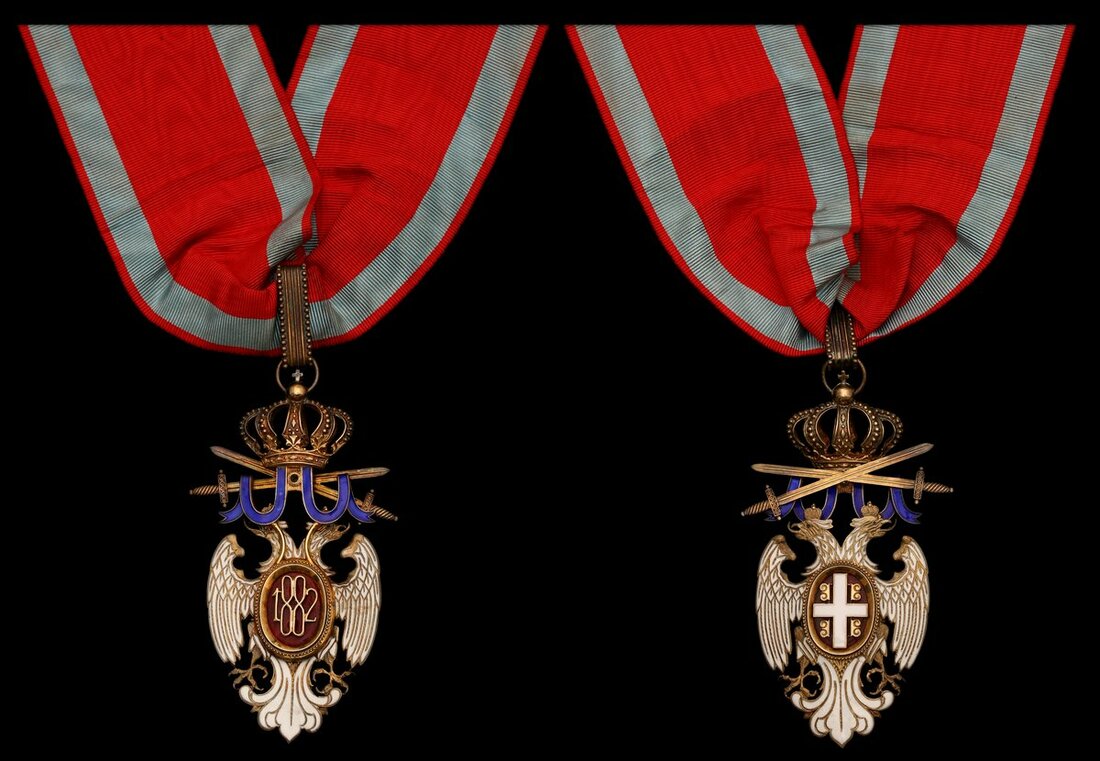 Serbia, Kingdom, Order of the White Eagle, Military Division 3rd Class neck Badge, by Arthus Bertrand, Paris, 90mm including crown and Crossed Swords suspension x 42mm, silver-gilt and enamel, good very fine, with full neck riband and in its Military Division case of issue, this embossed with Crossed Swords and 'III'