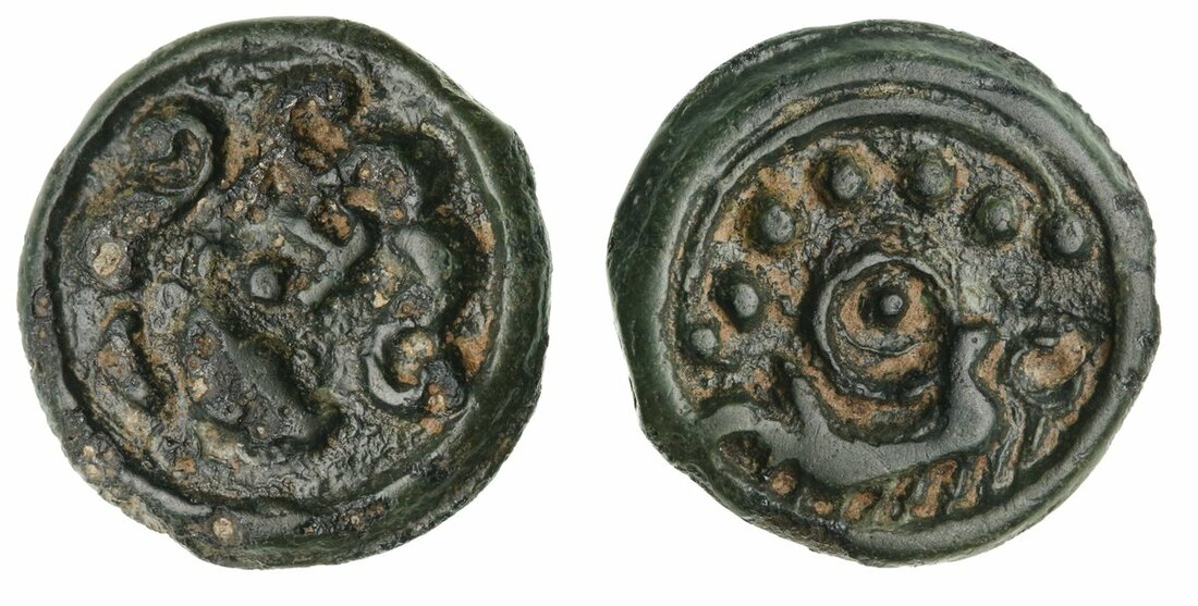 Continental Iron Age, Northeast Gaul, Suessiones Cast BI Potin, stylised head right, hair in thick S-shape above, two S-shapes joined together before face, rev. pellet-in-ring in centre, boar facing right with ring behind, torc below surmounted by six globules, 3.46g [53.39grns], 10h (ABC 85; DT 530; LT 7905), a most attractive example, some deposits but a bold strike, very fine and extremely rare as a British find
