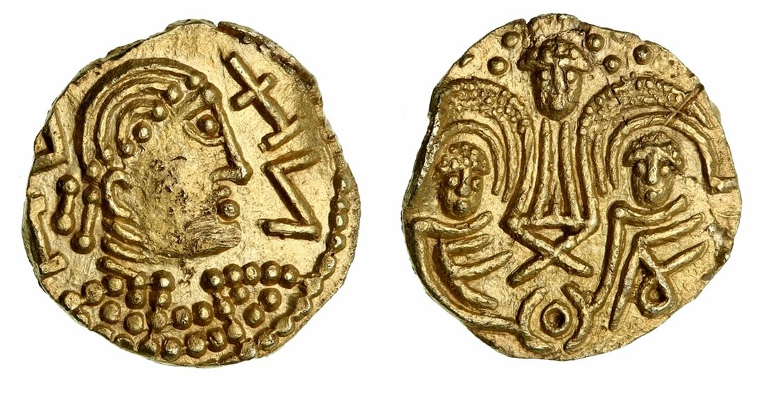 Early Anglo-Saxon England, Post-Crondall Phase (c. 655-675), Pale Gold Shilling, 'Two Emperors' type, in the style of an Imperial 4th Century Solidus, VAE | N, pearl-diademed and cuirassed bust right, cross-on-step before, rev. Victory (or Angel) spreading wings over two seated Emperors, 1.30g [20.06gns], 12h (SCBI 4 [Copenhagen, Part I], 19-21; SCBI 20 [Mack], 308; North 20; S.767), with a light scuff to chin and resulting furl to edge of flan and stressing besides, otherwise with a glorious honey-golden tone, overlying uniform and extremely sharp devices, a most pleasing extremely fine, a superlative example for this popular type; still seldom encountered in commerce, especially so in this condition and with a secure pedigree