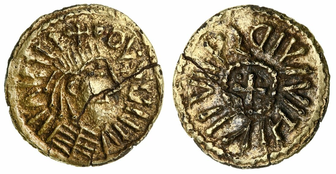 Anglo-Frisian, in the style of Louis the Pious (c. 814-840), Pale AV Solidus, c. 830, in imitation of Aix-la-Chapelle (Aachen), +DVVNNIVIIVIIII, some letters retrograde, laureate, draped bust right, with incised hair and trefoil of pellets for eye, rev. DIVINIVIIVIIVZ, cross pattée in 'suspended wreath', 4.28g [66.05grns], 11h (cf. Prou 1076; cf. BMC Carolingians 78; MEC -), cracked through but together, with porosity and details blundered, a rare example of the fledgling 'English' gold specie, struck details about very fine, albeit much as struck, and of numismatic importance