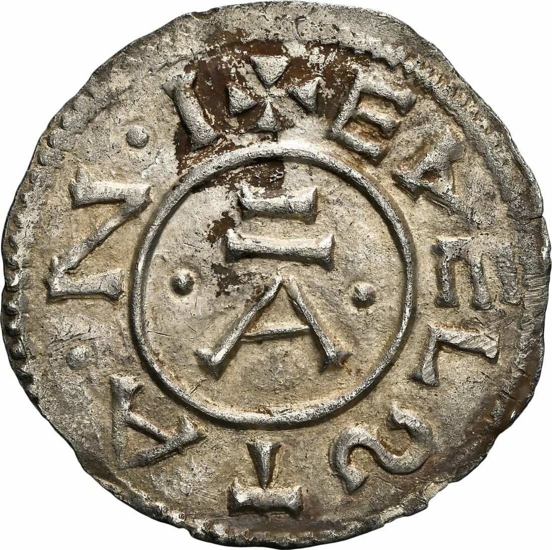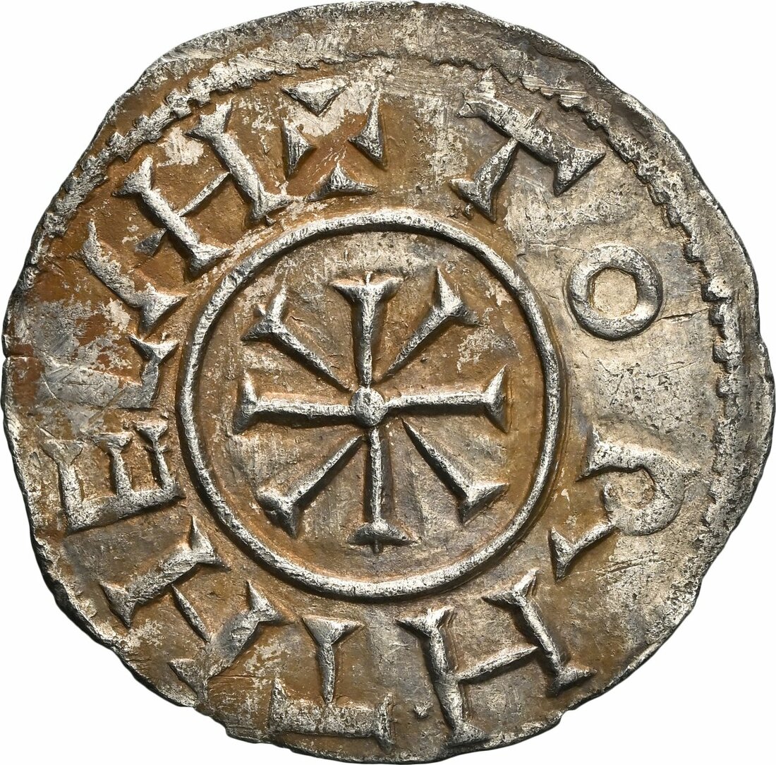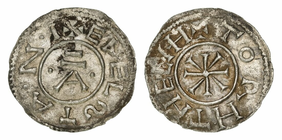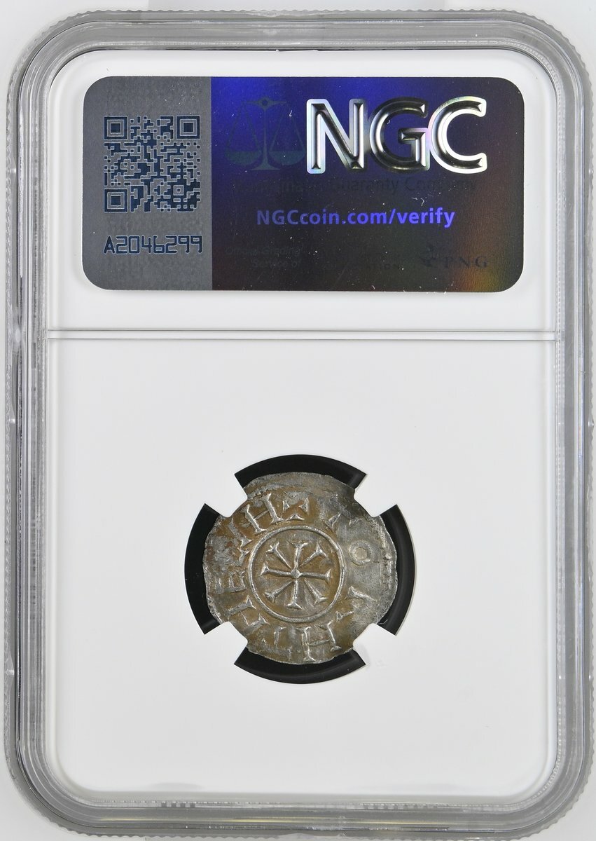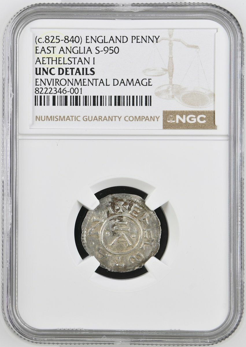 NGC UNC | East Anglia, Æthelstan I (c.825-845) Penny, 'Non-Portrait' Type, Ipswich [?], Torhthelm, + EDELSTA • N • I, around Alpha, flanked by two pellets all contained within linear circle, rev. + TORHTHELM, with stylised M, around cross pattée, with wedges in angles within linear circle, 1.38g [21.30grns], 12h (cf. SCBI 67 [BM], 850, 859, 872; cf. EMC 1982.0004, 2018.0089, 2021.0335 this coin, 2025.0025; Naismith E40.2 variant with inner circle on obverse; North 441; S.950), fully centred bold strike on good metal, lightly toned, about extremely fine for issue, a new variant, excessively rare thus, in NGC holder, graded Uncirculated (Cert. #8222346-001)