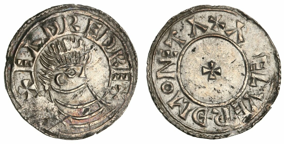 Eadred (946-955), 'Crowned Bust' Type, Penny, Uncertain Mint, Æthelweard, + EADRED REX, legend begins at 8 o'clock, crowned and draped bust right, breaking solid inner circle, rev. ADELVERÐ MONETA around small cross pattée in solid inner circle, 1.354g [20.895grns], 3h (CTCE 235; SCBI 34 [British Museum, Part V], 695; EMC 2024.0056 this coin; North 713; S.1115), the present third known specimen of this moneyer, with occasional field scuffs to a broad, full round planchet, approaching extremely fine, a delightful and charming portrait specimen for this King!