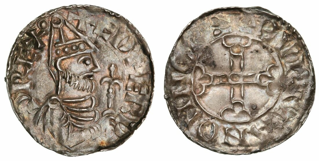 Edward 'the Confessor' (1042-1066), 'Pointed Helmet' Type, Penny, 1053-1056, Norwich, Thorsteinn, + EDPERD D REX • draped bust right, wearing pointed helmet, lys-tipped sceptre before, rev. + ÐVRSTAN ON NOR : voided short cross with triple-crescent terminals 1.33g [20.53grns], 6h (Freeman 166; SCBI 26 [East Anglia], 1314; North 825; BMC VII, 1100; S.1179), some carbon-staing and peripheral striking softness across an otherwise richly cabinet toned and broad, full flan, nevertheless a most pleasingly bold very fine, with wonderful fiery hues in deepest recesses, arresting thus
