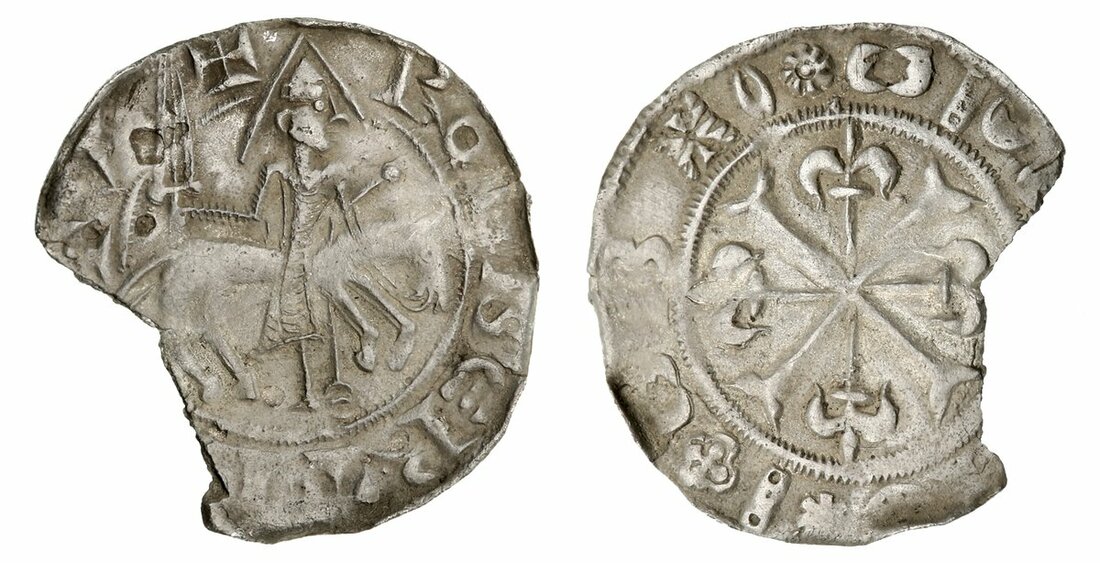 "The Anarchy", Baronial Magnates of York, Robert III de Stuteville († 1186), Penny, struck c. 1148-52 [?], on dies designed by Continental Engravers [?], + RODBERT[VS D S |] TV Knight on horseback right, brandishing sword, mantling (lambrequin) flying from conical helmet, rev. fine 'ornamental' legends with D I interspersed among spoked-wheels, cogwheels, cross pommée in quatrefoil and other devices, escarbuncle fleury at centre, 0.641g [9.89grns] (PAS LVPL-EE2868 this coin; Allen [2016], 'Phase 4', dies Bb, and pp. 309, no. 64 same dies; Mack [1966], no. 228c same dies; Lockett -; North 932; S.1321), broken and subsequently expertly conserved and repaired, otherwise a large fragment of excellent and stable metal, struck details bolder than very fine, OF THE HIGHEST RARITY and only the second to appear at auction in modern commerce