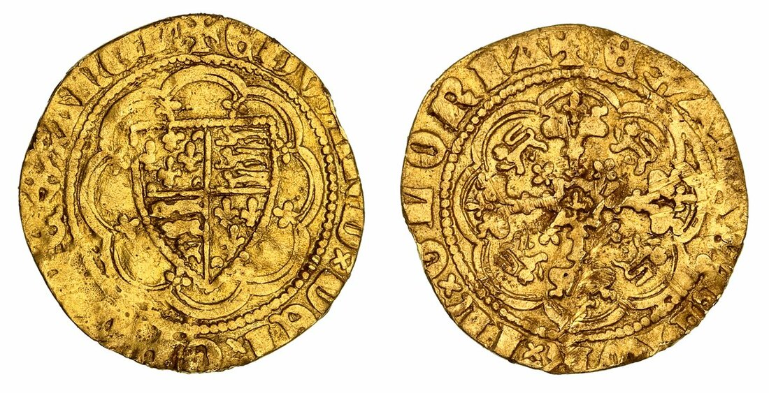 Edward III (1327-1377), Fourth Coinage, Treaty-Period, Quarter-Noble, 1361-1369, London (m.m.) EDWARD : DEI : GRA : REX : AnGL, double saltire stops, shield in tressure of eight arcs, rev. (m.m.) EXALTABITVR : In : GLORIA, double saltire stops, lys in centre of floriate cross in tressure of eight arcs, lions and lys in angles, 1.43g [22.07grns], 2h, m.m. cross 3 (Schneider I, 83-84; North 1243; S.1510), slightly clipped and some scratches to reverse, creased through flan and with a couple of resulting daylight spots, fine